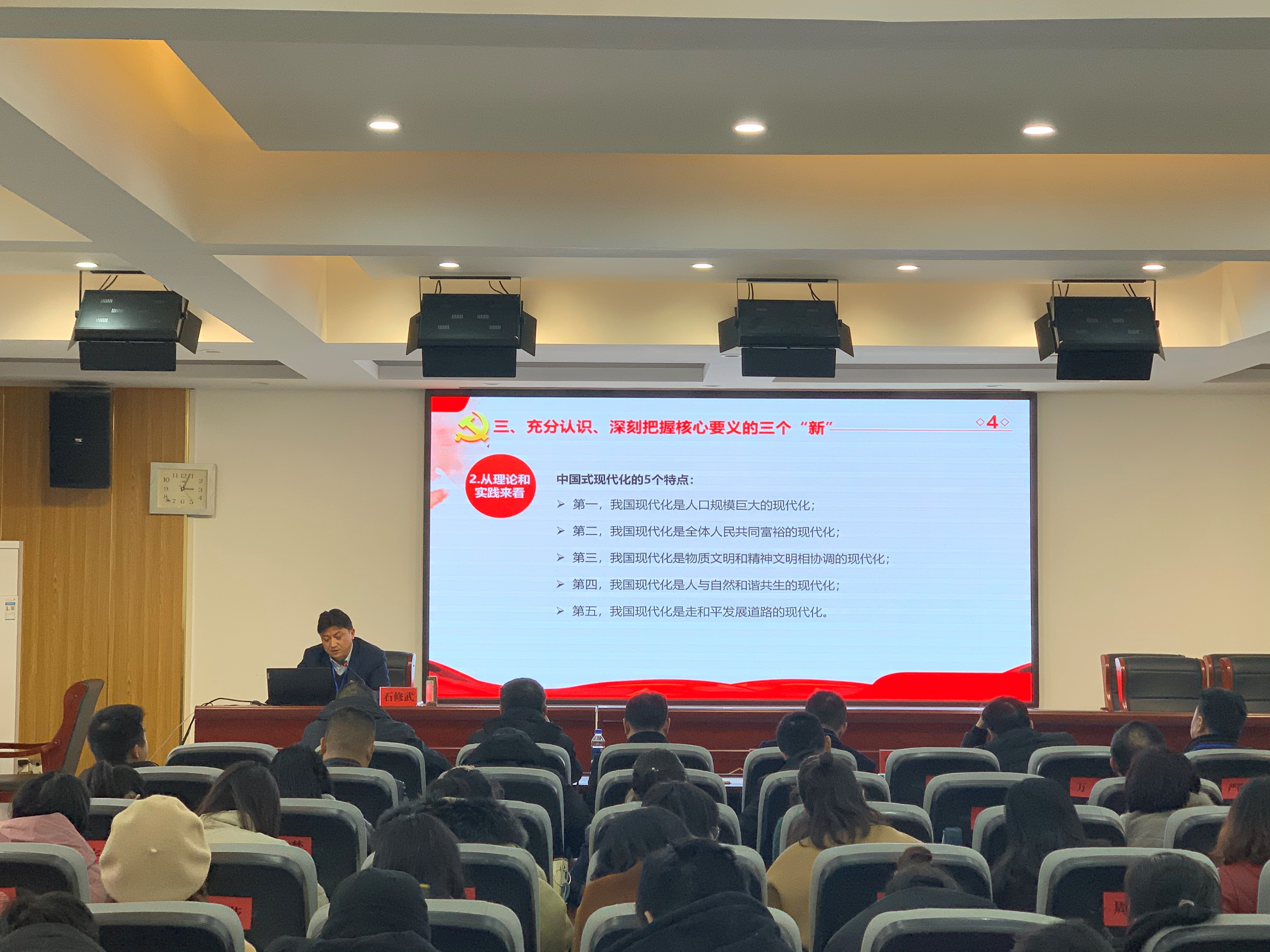 12月9日,校黨委書記石修武為全校教職工上黨的十九屆五中全會精神專題輔導黨課,以“學習貫徹黨的十九屆五中全會精神 開啟全面建設社會主義現(xiàn)代化國家新征程”為題,結合總書記考察湖南重要講話精神和湖南省及懷化市“十四五”規(guī)劃《建議》,從六個方面對習近平總書記的重要講話和十九屆五中全會精神進行全面系統(tǒng)地解讀。