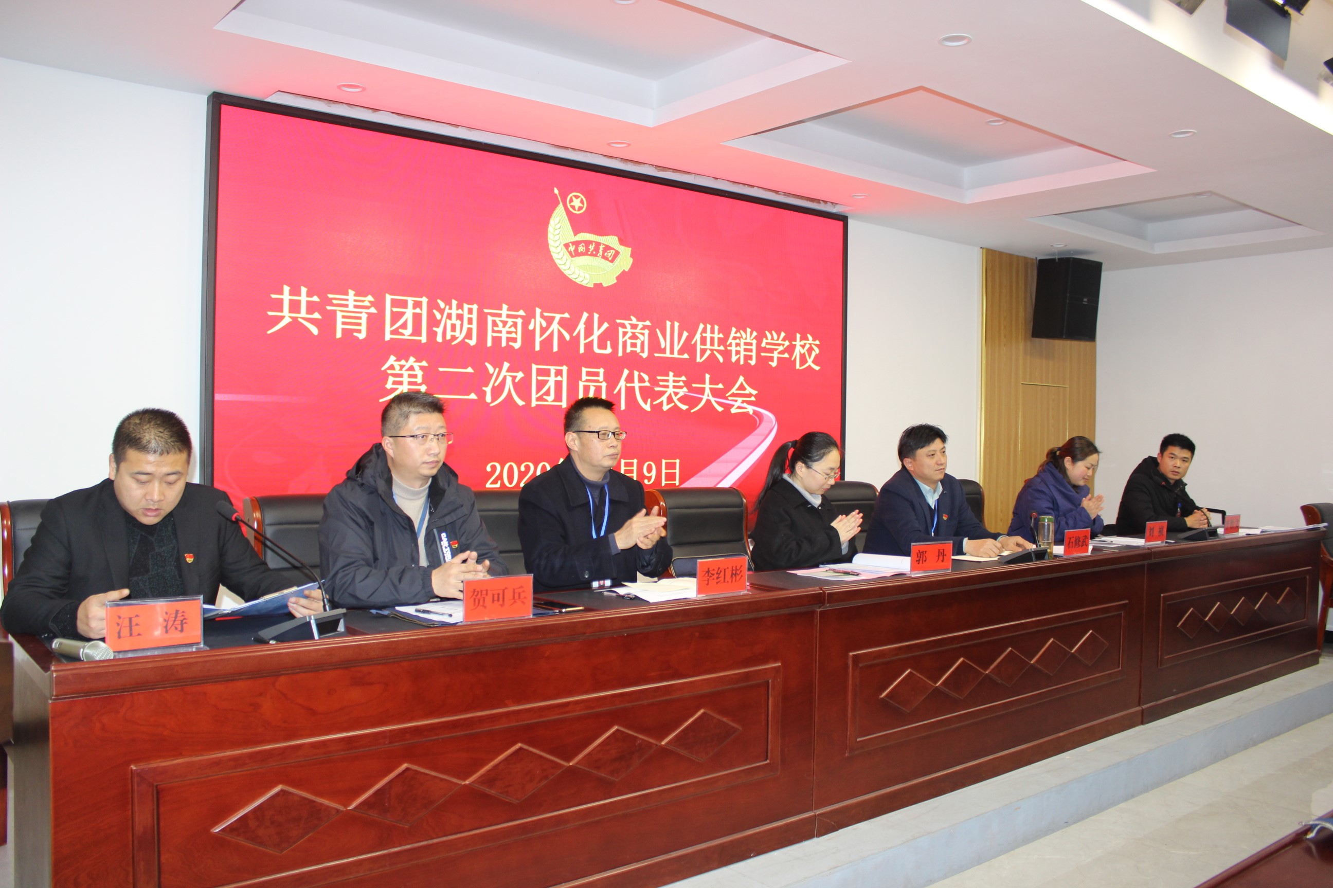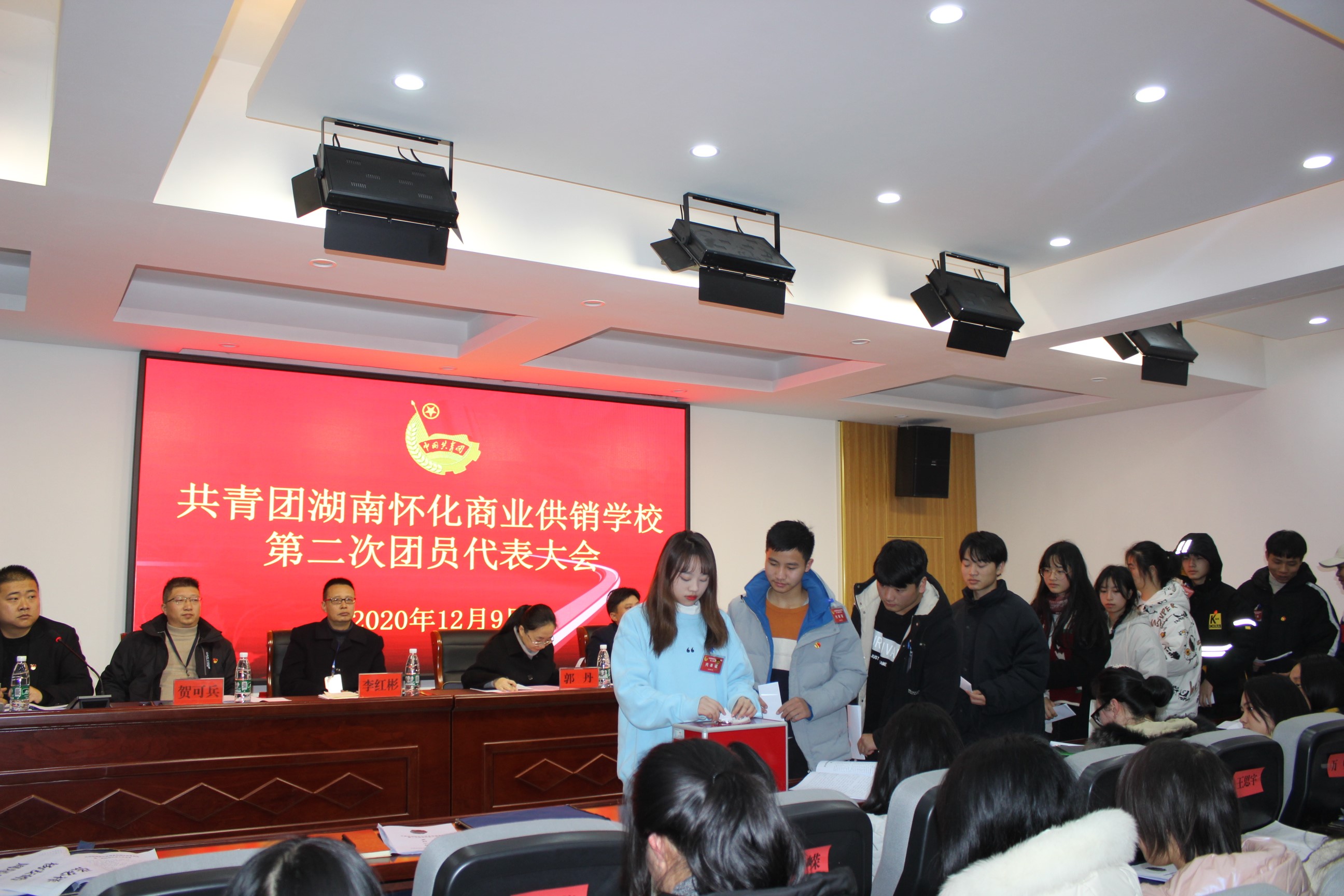 129日,共青團(tuán)湖南懷化商業(yè)供銷學(xué)校第二次團(tuán)員代表大會在莊嚴(yán)的中華人民共和國國歌聲中拉開序幕,共青團(tuán)懷化市委員會副書記郭丹同志、學(xué)少部劉禎同志,湖南懷化商業(yè)供銷學(xué)校黨委書記石修武同志,黨委副書記、校長李紅彬同志,黨委委員、副校長賀可兵同志,第一屆團(tuán)委書記李勝文同志,以及100名團(tuán)員代表參加此次會議。